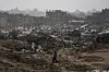 En palestinsk kvinne går gjennom et rasert område i Gaza by fredag.