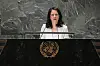 FORSVARSRETT: Tysklands utenriksminister Annalena Baerbock, her på talerstolen i FNs hovedforsamling i september, slår fast at Israel har rett til å forsvare seg både mot Hamas, Hizbollah og Iran. Foto: Pamela Smith / AP / NTB