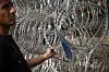 En migrant står utenfor piggtrådgjerdet som ungarske myndigheter har bygget opp langs grensen til Ungarn. Tyskland advarer på ny EUs medlemsland om at dem som ikke deler europeiske verdier og solidaritet, kan risikere å miste pengestøtten fra unionen. Foto: Stoyan Nenov / Reuters / NTB scanpix