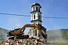 RIVES: Den ortodokse kirken i landsbyen Konjevic Polje ved Srebrenica i Bosnia rives etter en 20 år lang juridisk strid. Kirken var bygd på tomta til en bosnisk kvinne som mistet mannen sin i Srebrenica-massakren og selv måtte flykte. Foto: Sladjan Tomic / AP / NTB
