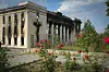 UTBOMBET: Røde roser foran et utbombet teater i byen Lysytsjansk i Luhansk-regionen i Øst-Ukraina 16. juni. Hittil i krigen har over 150 ukrainske kulturarvsteder blitt delvis eller fullstendig ødelagt i krigføringene.