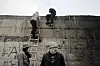 Palestinske demonstranter klatrer opp en stige foran den omstridte muren som deler Abu Dis fra Jerusalem på Vestbredden. Foto: Ammar Awad / Reuters / NTB scanpix