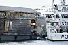 Arken har fått en diger flenge foran på styrbord side og har fått taubåthjelp for å komme seg til kai igjen.