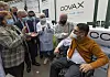 Den palestinske helseministeren Mai Alkaila (t.v.) og statsminister Mohammad Ishtayeh klapper idet en mann får en dose med Pfizer/Biontechs koronavaksine. Utrullingen av koronavaksiner startet på Vestbredden søndag. Foto: Nasser Nasser / AP / NTB