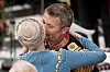 ARVTAKEREN: Danskenes påtroppende konge gir sin mor en klem under en gallabankett på Christianborg høsten 2022. Men vil han omfavne sin mors kirkelige engasjement?